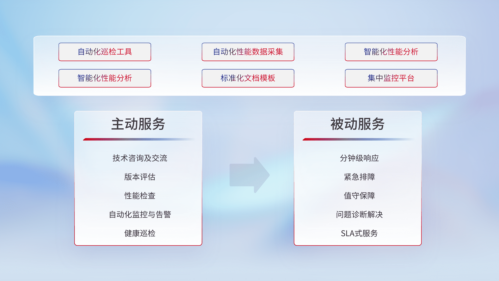 智能化工具和标准化文档,,,保障服务质量,,提供主动服务(包含技术咨询、、版本评估、、、性能检查、、、、自动化监控与告警、、健康巡检)和被动服务包含(分钟级响应、、、紧急排障、、、值守保障、、、问题诊断解决、、、SLA服务)。。